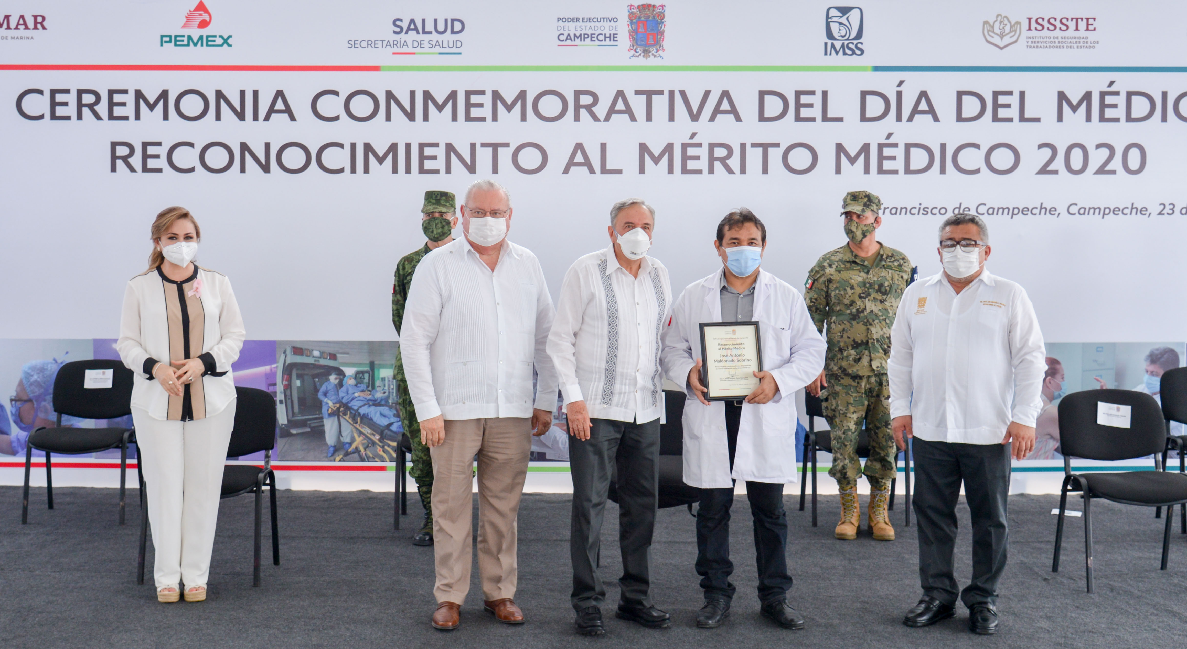 Durante la ceremonia, Aysa González entregó el Mérito Médico 2020, en reconocimiento a su vocación de servicio e investigación en salud, a los doctores Angélica Díaz Vázquez, del hospital general de zona del IMSS, de Ciudad del Carmen; José Antonio Maldonado Sobrino, de la clínica hospital del ISSSTE Patricio Trueba, y Jorge Mariano de Jesús Saravia Chávez, de la unidad operativa de hospitalización y terapia intensiva del décimo Batallón de Infantería.