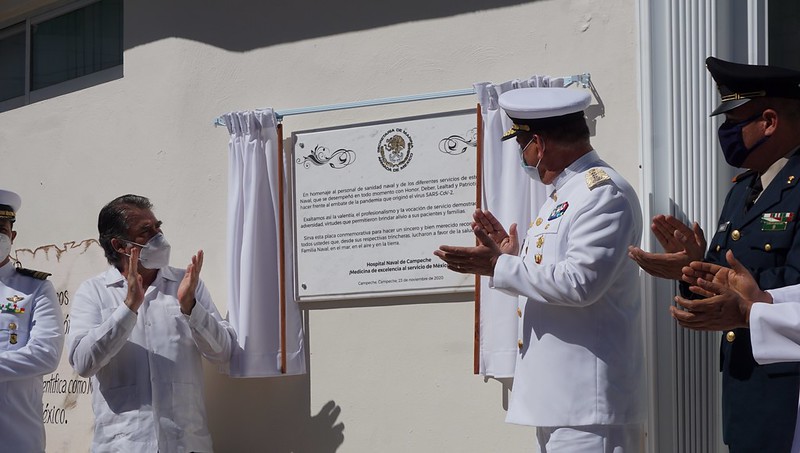 Durante la ceremonia de conmemoración del Día de la Armada de México, elementos de la Secretaría de Marina (Semar) entregaron reconocimiento a los hospitales Javier Buenfil Osorio dependiente a la Secretaría de Salud del Estado, así como a las delegaciones del Instituto Mexicano del Seguro Social y el de Servicios y Seguridad Social de los Trabajadores del Estado, (IMSS e ISSSTE respectivamente), por su honorable labor durante la pandemia en Campeche.