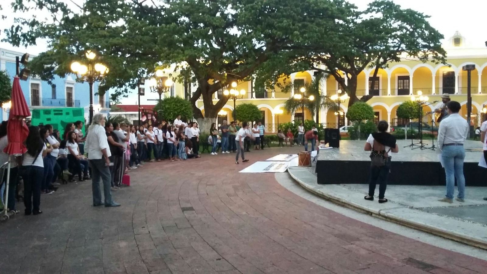 “¡Hecelchekán, Campeche, en pie de lucha”, se leía en letras negras sobre una enorme manta roja que sostenían dos mujeres en cada uno de sus extremos. “El color es símbolo de la sangre derramada el 2 de octubre del año 1968, en la Plaza de las Tres Culturas de Tlatelolco”, alcanzó a decir uno de los estudiantes.