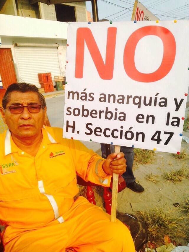En protesta porque Víctor Kidnie de la Cruz, secretario general de la Sección 47 del sindicato petrolero, le bloqueó su derecho laboral quitándole una plaza, el ex petrolero jubilado, Nicéforo Astudillo Lozano (de 60 años de edad) se encadenó en huelga de hambre. A gritos, exigió la renuncia de Víctor Manuel Kidnie de la Cruz por ser "represivo y corrupto". El encadenado instaló pancartas con los lemas ¡Basta de corrupción y represión! ¡No más represión ni corrupción! ¡Fuera Víctor M. Kidnie de Cruz! ¡No más abuso del poder, Víctor Kidnie de la Cruz!. El que fuera petrolero reclama que, por derecho estatutario, la plaza laboral que él dejó vacía al jubilarse debe ser cubierta por su hijo, Luis Ángel Astudillo Loeza.
