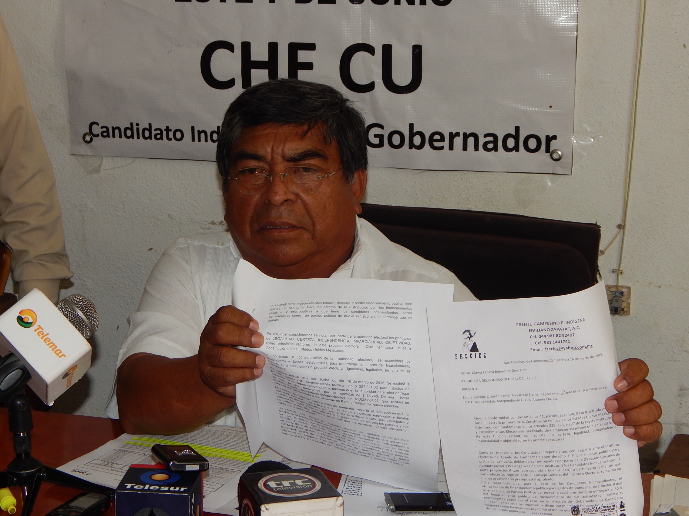 Luego de denunciar las anomalías en el Instituto Electoral del Estado de Campeche, como el retraso en los fondos públicos para su campaña de proselitismo, Luis Antonio Che Cu, candidato independiente al gobierno de Campeche, recibió la prerrogativa para poder afrontar los gastos de su campaña.