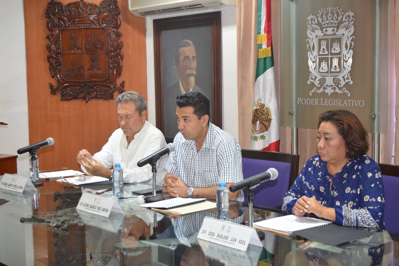 Aspectos de la sesión de la comisión permanente del Congreso del estado: diputados Manuel Ortega Lliteras, Silverio Baudelio Cruz Quevedo y Eda Marlene Uuh Xool.