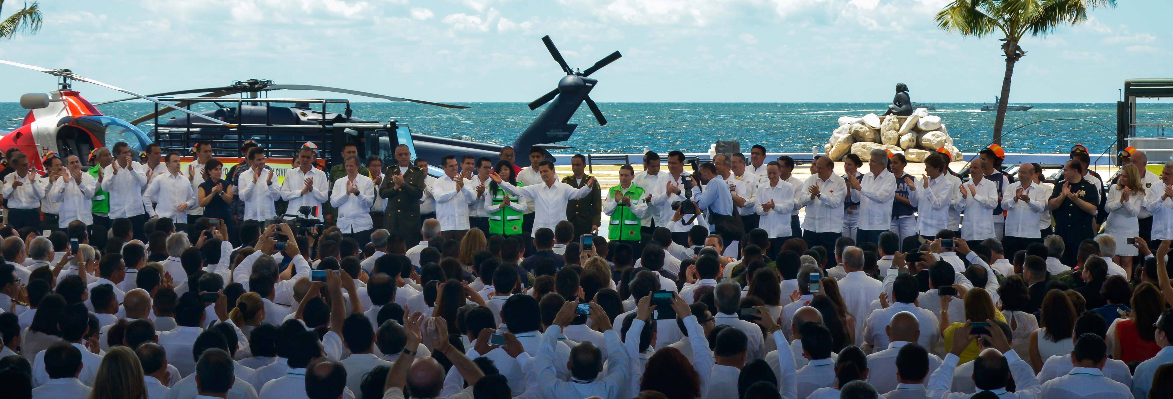 Acompañado por el secretario de Gobernación, Miguel Ángel Osorio Chong, los titulares de la Sedena y Semar; de los gobernadores de Campeche, Alejandro Moreno Cárdenas; de Yucatán, Rolando Zapata Bello, y de Quintana Roo, Roberto Borge Angulo, así como  de los titulares del Sistema Nacional de Protección Civil , de la Conagua y del representante de