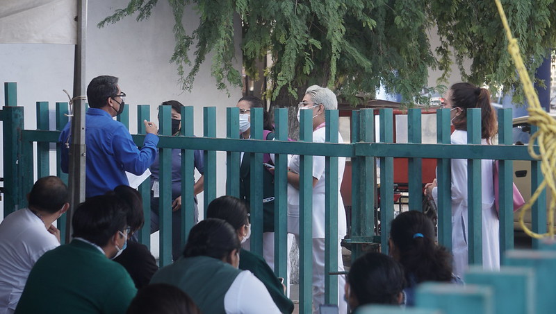 Cuerpos médicos que laboran en el Instituto Mexicano del Seguro Social (IMSS) continúan manifestándose de manera esporádica en sus centros de trabajo, demandando les apliquen la vacuna pues quieran o no tienen contacto con pacientes COVID ya que los sospechosos llegan, dicen sentirse mal y de acuerdo a sus síntomas son canalizados a los hospitales correspondientes.