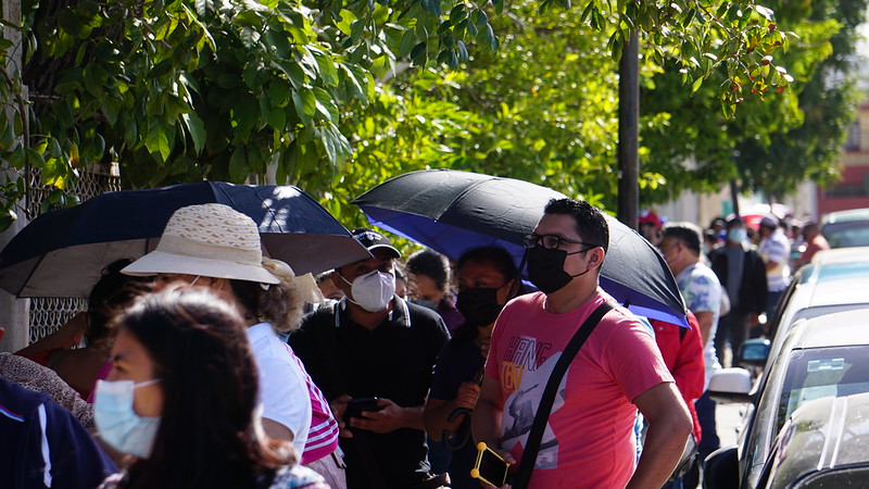 En el caso del Hospital de Zona 04 del IMSS, el punto de vacunación que mayor número personas formadas presentó, la fila alcanzó la cuadra y media, generando molestia.