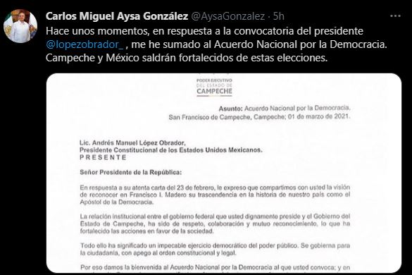 A través de una carta dirigida al presidente de la México, Andrés Manuel López Obrador, el jefe del ejecutivo estatal de Campeche, Carlos Miguel Aysa González, reconoció su labor y dijo sumarse al Pacto por la Democracia propuesto para tener un proceso electoral limpio y transparente que garantice el derecho al sufragio.
