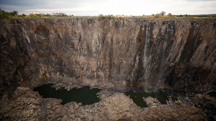La sequía de este año en el sur de África provocó estragos en las cataratas Victoria, que en conjunto con su parque nacional, son de los sitios más icónicos del continente, y en las que apenas gotea una mínima cantidad de agua de las rocas que se elevan a más de 100 metros de altura.