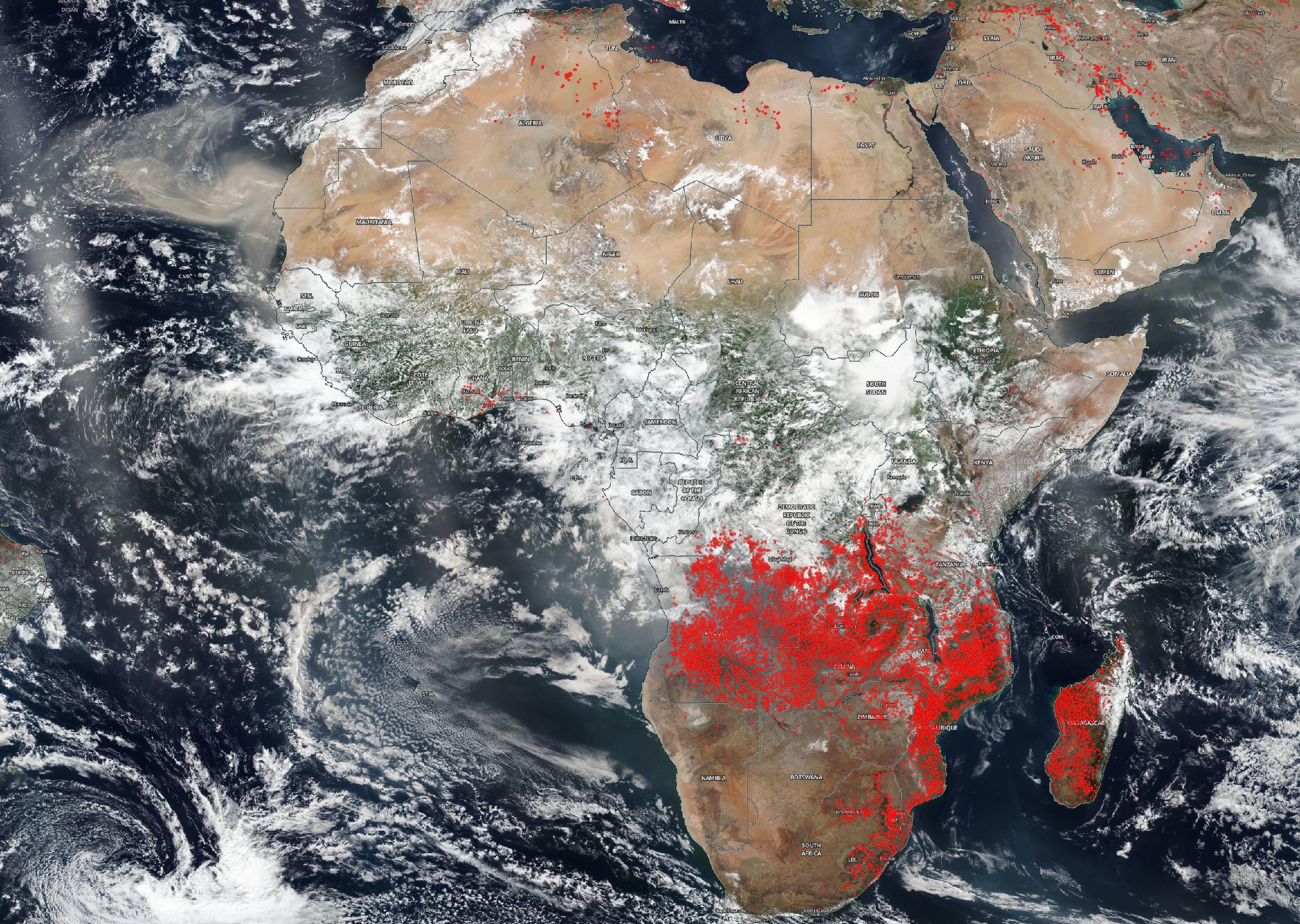 La Administración Nacional de la Aeronáutica y del Espacio (NASA) dice que al menos el 70 por ciento de los 10 mil incendios que arden en todo el mundo en un día promedio de agosto están en África. Sin embargo, la agencia dice que el número es uniforme de un año a otro.