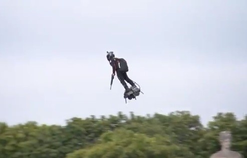 Este artefacto, llamado Flyboard e inventado por el propio Zapata, está propulsado por cinco turborreactores de aire que permiten despegar y avanzar a hasta 190 kilómetros por hora, con una autonomía de unos diez minutos.