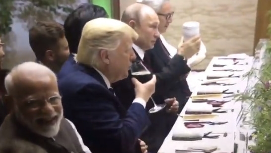 Las imágenes televisivas mostraron a Putin brindando a distancia con su homólogo estadunidense Donald Trump, ambos a cada lado del anfitrión de la cumbre, el primer ministro japonés Shinzo Abe.