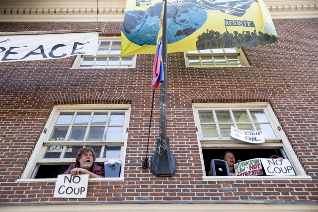 "Arrestaron a tres, dos de los nuestros y uno de los de ellos", dijo a la AFP Medea Benjamin, militante de Code Pink, una de las organizaciones que conformaron el Colectivo para la Protección de la Embajada, que desde hace dos semanas y y media, viven en la sede diplomática, con la anuencia del gobierno de Nicolás Maduro.