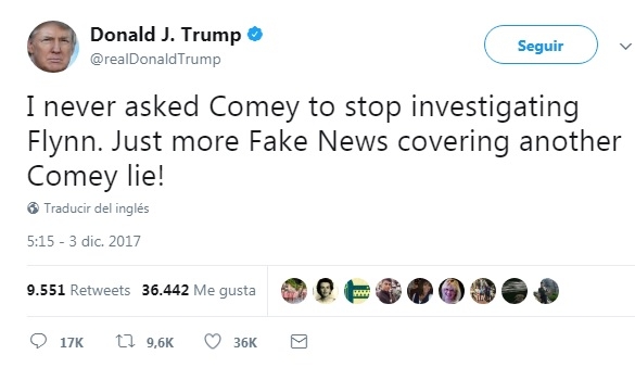 Trump dijo en su tuit matutino del domingo: "Nunca le pedí a Comey que dejara de investigar a Flynn. ¡Solo más noticias falsas para cubrir otra mentira de Comey!"