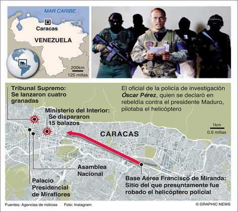 La noche del martes, un efectivo del Cuerpo de Investigaciones Científicas, Penales y Criminalísticas, hurtó un helicóptero de una base aérea en Caracas y sobrevoló los edificios del Poder Judicial y del Ministerio del Interior, a los que disparó y lanzó granadas sin dejar víctimas.