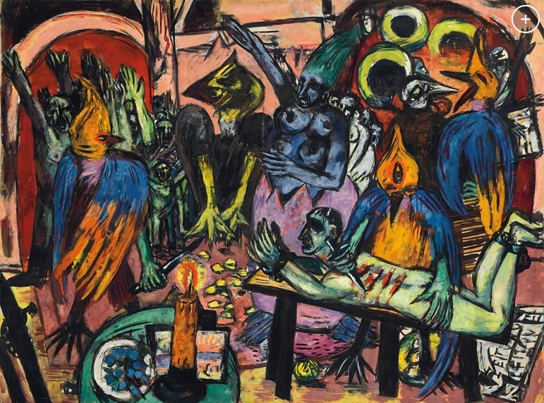 El infierno de los pájaros, en la que aparecen criaturas parecidas a pájaros abatiéndose sobre hombres desnudos, fue pintada entre 1937 y 1938 y constituye una de las obras anti-nazis más importantes que creó Beckmann.