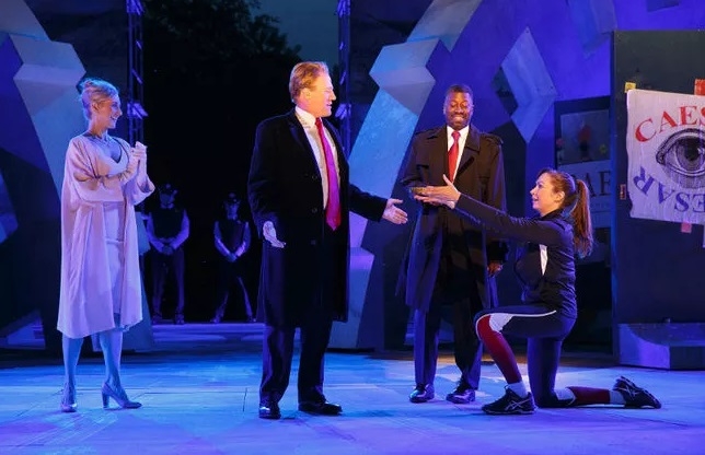 La decisión de darle un parecido de Trump al personaje principal de Julio César es provocadora, dada su famosa escena del asesinato, a la que se suma, en esta producción, un desnudo.