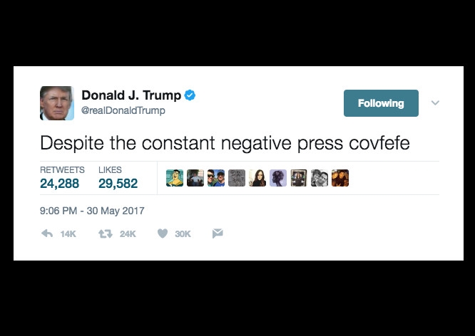 "Despite the negative press covfefe" ("Pese a la negativa 'covfefe' de la prensa") versaba el tuit, en lo que muchos usuarios y periodistas consideran un simple error de tipeo de la palabra "coverage" ("cobertura"), en el marco de las acusaciones que ha lanzado una y otra vez contra los medios que difunden fake news (noticias falsas).