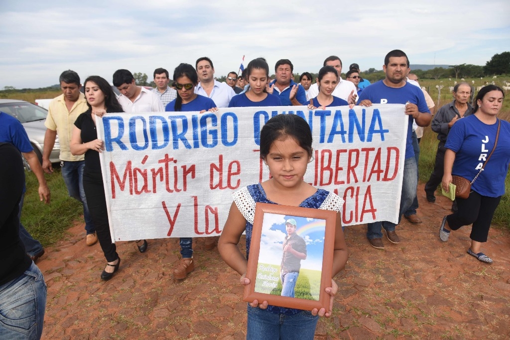 Una multitud de personas acompañó este domingo el sepelio de un político opositor paraguayo Rodrigo Quintana, quien fue asesinado por la policía la madrugada del sábado tras el asalto e incendio del edificio del Congreso por manifestantes antigubernamentales.Quintana, de 25 años de edad, presidente de la Juventud Liberal y a punto de titularse de ingeniero agrónomo, recibió impactos de perdigones de metal de una escopeta disparada por un agente antimotín que penetró con otros policías en la sede del opositor Partido Liberal persiguiendo a manifestantes tras disturbios en las calles de Asunción."Rodrigo Quintana, mártir de la libertad y la democracia", rezaba un gran cartel que encabezó la procesión, en un trayecto de tres kilómetros a pie hasta el cementerio en la localidad de La Colmena, 130 km al sureste de Asunción.Una de sus hijas pequeñas transportó una foto de su padre."Truncan una vida por razones desenfrenadas. Basta de violencia", dijo el sacerdote Osvaldo Cañiza en la misa fúnebre, al tiempo que la muchedumbre gritaba consignas contra el presidente paraguayo, Horacio Cartes.En horas de la tarde y la noche del viernes, los enfrentamientos entre opositores y la policía dejaron una treintena de heridos durante el asalto, destrucción e incendio de varias dependencias del Congreso.