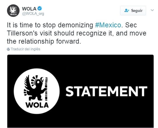 “Es hora de dejar de demonizar a México. La cooperación, en lugar de retórica acalorada sobre 'hombres malos', es esencial para ambos países. El secretario Tillerson debe reconocer la importancia de la relación de los Estados Unidos y México y los avances que se han hecho para fortalecerla”, declara la experta Maureen Meyer.