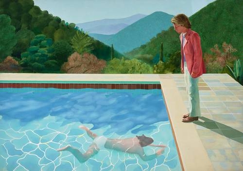 Siguen, de mediados de los 70, las imágenes icónicas de las piscinas en California, que como ninguna otra obra lo representan; [i]A Bigger Splash[/i] (1967), conservada en la Tate, que es seguramente su creación más célebre, refleja no sólo su vida bohemia y hedonista sino la fascinación estética que en David Hockney despertaba el agua durante su estancia en California.