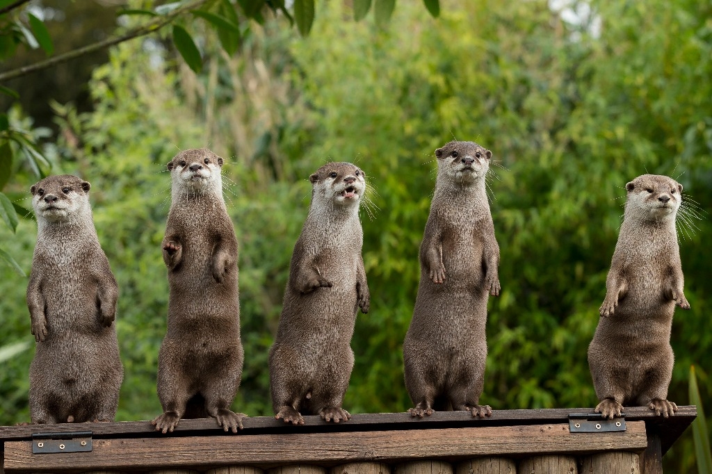 Una familia de nutrias, paradas sobre una valla, en la ciudad inglesa. Foto: Ap