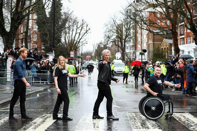 El príncipe Enrique de Inglaterra y el cantante Jon Bon Jovi recrearon una de las portadas de discos más famosas de los Beatles el viernes, caminando por el cruce peatonal ubicado frente a los estudios Abbey Road en el norte de Londres.