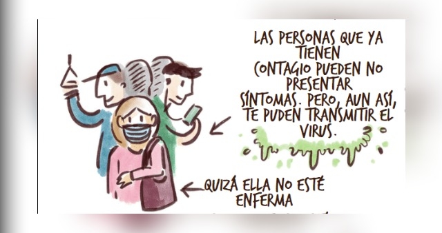 “Las personas que ya tienen contagio pueden no presentar síntomas. Pero, aun así, te puede transmitir el virus”, señalan las ilustraciones, las cuales también sugieren recomendaciones como lavarse las manos constantemente, no usar cubrebocas por más de un día y no compartir las comidas .