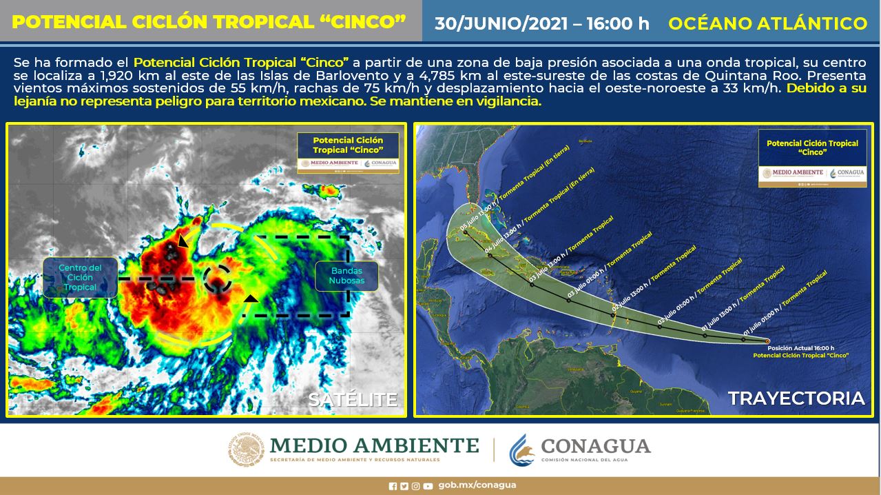 Debido a la proximidad con el Arco de las Antillas Menores, la baja presión con alto potencial de tener desarrollo ciclónico ha sido nombrada potencial ciclón tropical Cinco. El fenómeno meteorológico se encontraba esta tarde en las aguas del océano Atlántico en la Longitud 09,6° Norte y Longitud 43,7° Oeste a aproximadamente mil 920 kilómetros al este del Arco Antillas Menores, tiene vientos sostenidos de 55 km/h con rachas mayores, se mueve rápido hacia el oeste y noroeste a 33 km/h y tiene una presión barométrica de 1.008 hPa.