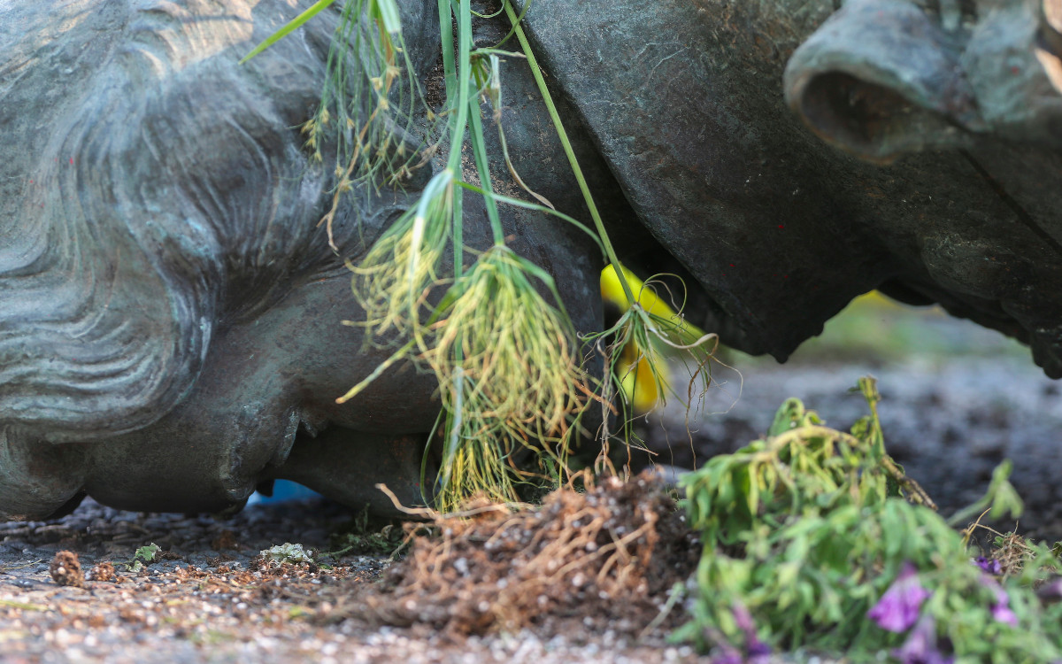 Los manifestantes, muchos de los cuales vestían ropa naranja, también patearon la derribada estatua y bailaron a su alrededor. El pedestal y la estatua fueron pintados con marcas de manos en color rojo.