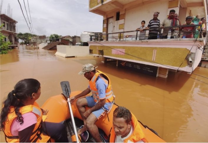 En partes de Chiplun, el nivel del agua subió el jueves a casi seis metros tras 24 horas de lluvia ininterrumpida que inundó carreteras y viviendas.