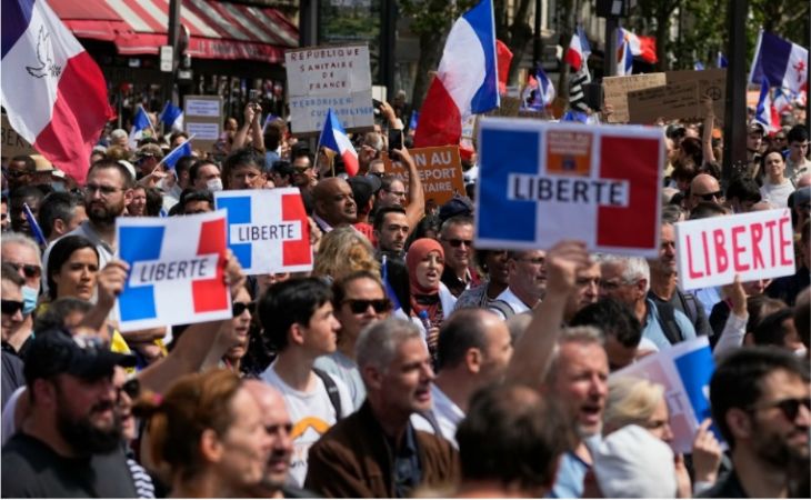 Miles de personas protestaron el sábado en París y otras ciudades francesas contra el requisito de una tarjeta sanitaria obligatoria para entrar en una serie de lugares públicos, que fue introducida por el gobierno en su lucha contra una cuarta ola de infecciones.
