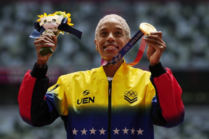 Frente al sol de Tokio, Yulimar Rojas deslumbra con su alegría al recoger de la bandeja la medalla de oro.
