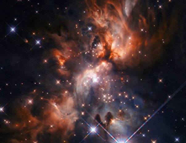 En el centro de la imagen captada por Hubble, una estrella masiva se está formando y explotando cavidades a través de las nubes con un par de chorros de gran alcance, extendiéndose hacia la parte superior derecha e inferior izquierda de la imagen.