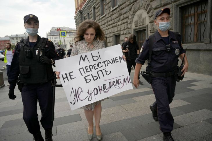 Los periodistas realizaron piquetes individuales en las afueras de la sede central de la agencia nacional de inteligencia FSB, en la Plaza Lubyanka, en la capital.