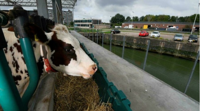 En Holanda, donde la superficie agrícola es escasa y la amenaza del cambio climático es diaria al estar parte del país bajo el nivel del mar, esta plataforma de tres pisos de cristal y acero quiere mostrar el "futuro de la ganadería".