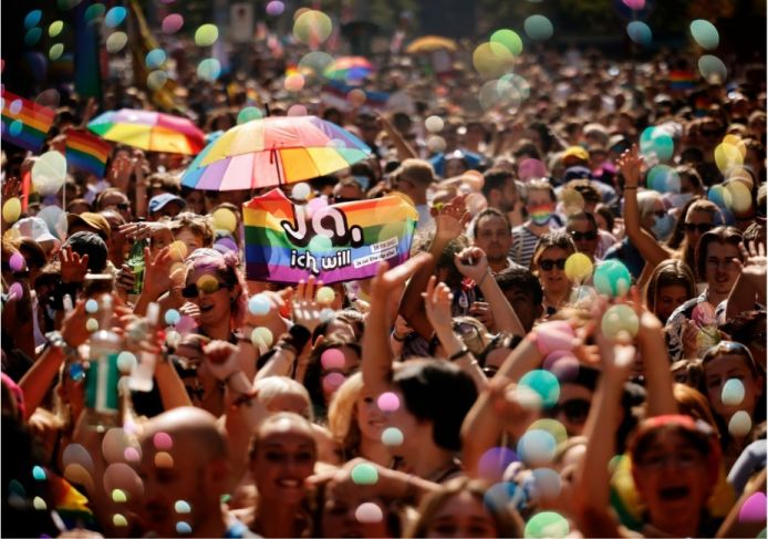 Bajo un sol abrasador y con banderas arcoíris estampadas con un "Ja" (sí) a favor del "matrimonio para todos", los participantes (20 mil según los organizadores) respondieron a la convocatoria de más de 70 organizaciones de las comunidades de lesbianas, gays, bisexuales, transexuales y queer, constató un fotógrafo de la Afp.