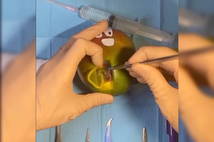 Una naranja que da a luz, un plátano que se realiza una operación estética y hasta una berenjena con torsión testicular son algunos de los pacientes que desfilan por el quirófano de Robin Goncet, un estudiante de medicina en Francia.