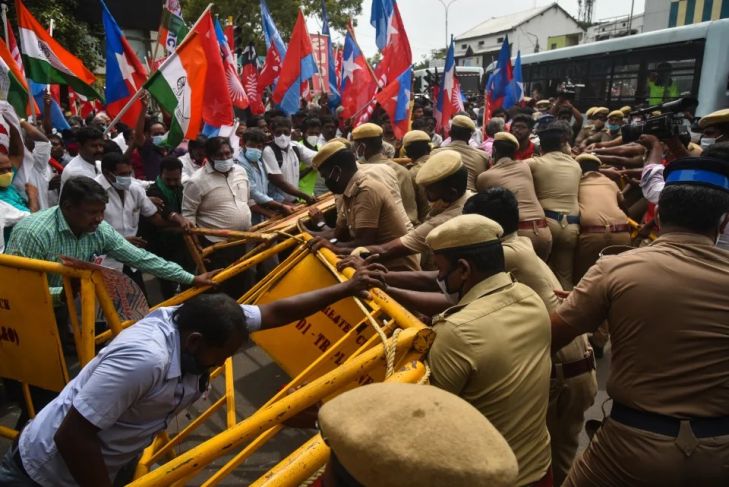 Respondiendo a la llamada del Samyukt Kisan Morcha (SKM), una organización que reúne a decenas de sindicatos agrícolas, los campesinos efectuaron cortes de carreteras y manifestaciones tras una llamada a la huelga que marca el décimo mes de protestas continuas en el país asiático contra estas leyes.