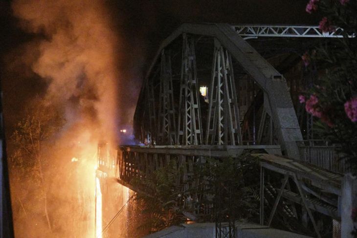 Un segmento del puente que contenía un canal peatonal y cables eléctricos se desprendió y cayó al río. Un incendio similar hace varios años también estalló en el campamento de casuchas de los desamparados.
