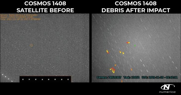Las imágenes fueron capturadas por Numerica Corp., una empresa estadunidense con sede en Colorado que proporciona seguimiento de objetos de desechos espaciales, y compartidas por el socio de la empresa, Slingshot Aerospace, en Twitter. Muestran imágenes y videos de los escombros a raíz de una prueba antisatélite de ascenso directo realizada por Rusia el lunes que envió un misil desde tierra para destruir un satélite desaparecido llamado Cosmos-1408.