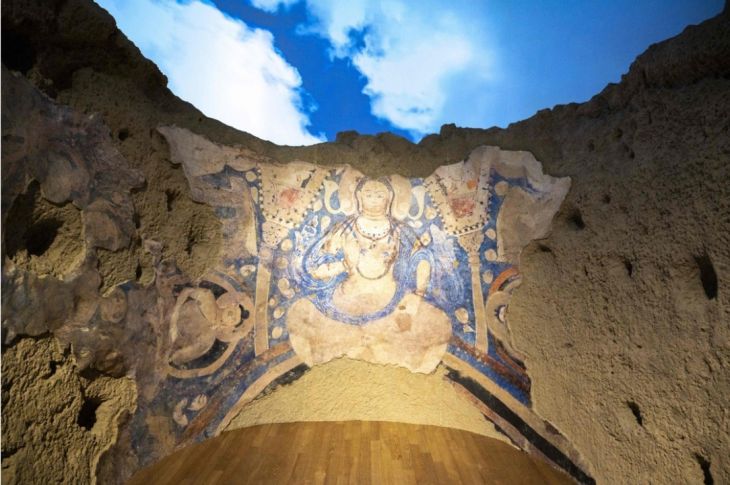 La pintura original se encontraba en el techo de una cueva cercana a las famosas estatuas, y representaba a un Bodhisattva azul, un discípulo de Buda que pospone su acceso al Nirvana (proceso espiritual budista) para ayudar a la gente corriente.