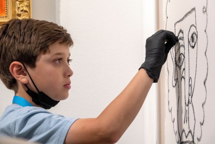El niño, que, según relató su madre, es muy buen estudiante pero "le gusta demasiado el arte" y no rinde todo lo que podría, trazó con un carboncillo uno de sus característicos rostros cubistas y luego difuminó con un dedo enguantado las líneas.