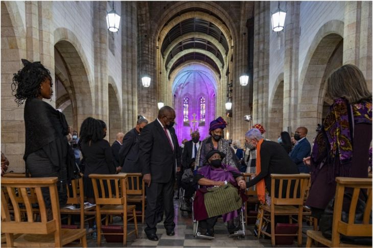 Durante un servicio familiar privado, el arzobispo Thabo Makgoba depositó una pequeña urna con los restos de Tutu en el piso frente al altar principal de la catedral St. George. La viuda, hijos y otros familiares de Tutu asistieron al servicio, que duró apenas media hora.