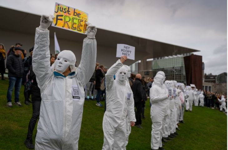 Antes de que la policía interviniera, algunos participantes desplegaron un letrero que decía "Menos represión, más atención" cerca del Museo Van Gogh. Un grupo de personas con overoles blancos y mascarillas sostenían letreros, incluido uno que decía: "No es por el virus, es por el control" en un lado y "Libertad" en el otro. Una persona caminó entre la multitud portando una bandera de "Trump 2024".