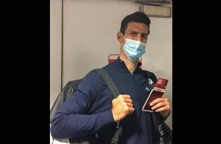 El tenista serbio bajó del avión con dos maletas y mascarilla, tras aterrizar a las 05:32 horas local en el Aeropuerto Internacional de Dubai.