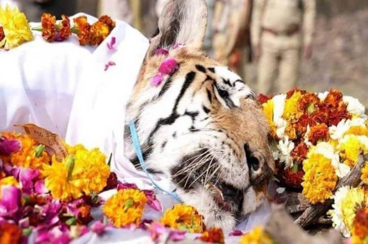 Envuelta en una sábana blanca, rodeada de flores y dentro de una pira de madera, es como la tigresa Collarwali fue venerada por los pobladores de Madhya Pradesh, India, quienes realizaron un ritual para despedirla y agradecerle su trabajo de conservación en la Reserva de Tigres de Pench.