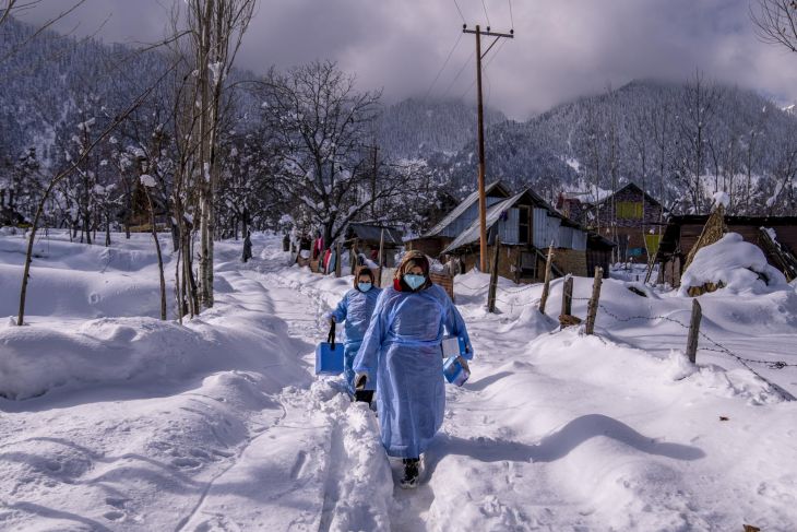 En una aldea del Himalaya en la parte de Cachemira controlada por la India, la joven trabajadora de salud Masrat Farid empacó su bolso con vacunas en una gélida mañana de enero mientras los fuertes vientos azotaban la nieve.