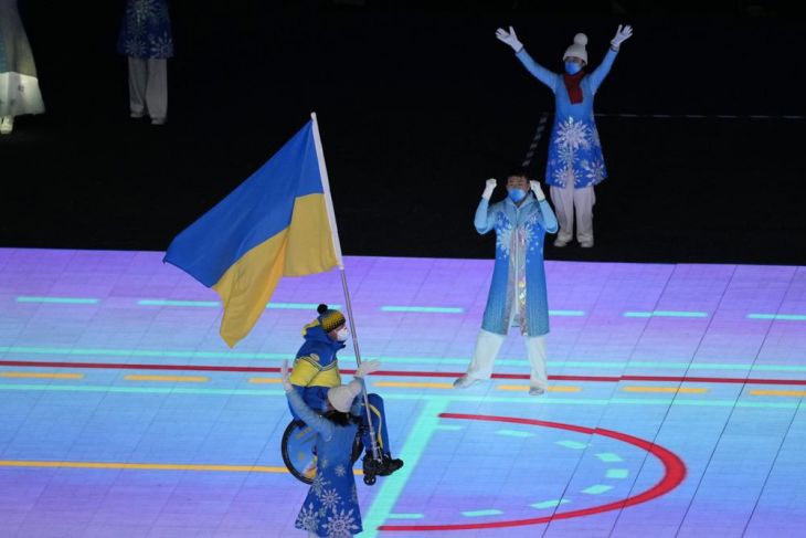 El miembro del equipo ucraniano, Maksym Yarovyi, llevó la ahora ampliamente conocida bandera azul y amarilla del país al frente de una delegación de 20 personas que ingresó al estadio en la inauguración. Todos los atletas y espectadores usaron máscaras faciales para protegerse contra el coronavirus, incluido el presidente chino, Xi Jinping, y otros dignatarios.