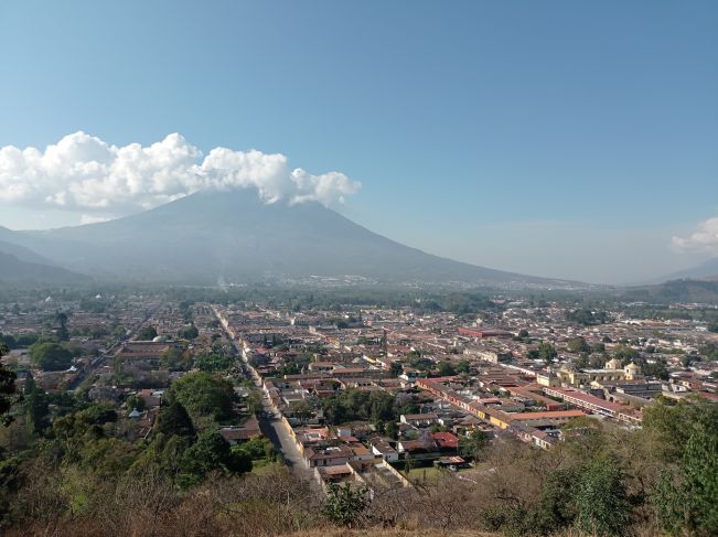 Desde su centro puede observarse el volcán de agua (que propició la tragedia que enterró parte de la ciudad), el de Fuego y el Acatenango, un trío de colosos que resguarda la ciudad. Para los más aventureros hay disponibles tours por las laderas de este último. La mejor vista de la ciudad es desde el cerro de la cruz, un mirador al que se puede acceder gratuitamente y que da una panorámica ideal para los visitantes.