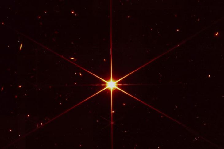 La forma de los espejos del Webb y sus filtros hicieron que la estrella resplandeciente luciera más roja y puntiaguda, pero el fondo realmente se robó el espectáculo.