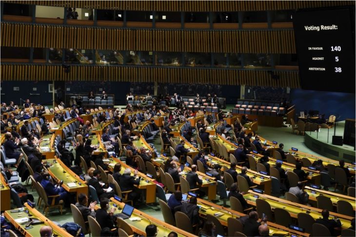 Con 140 votos a favor, cinco en contra y 38 abstenciones, se aprobó la propuesta humanitaria de México y Francia por la que se hace un llamado al inmediato cese a las hostilidades en Ucrania, a la protección de los civiles y al respeto del derecho humanitario internacional.